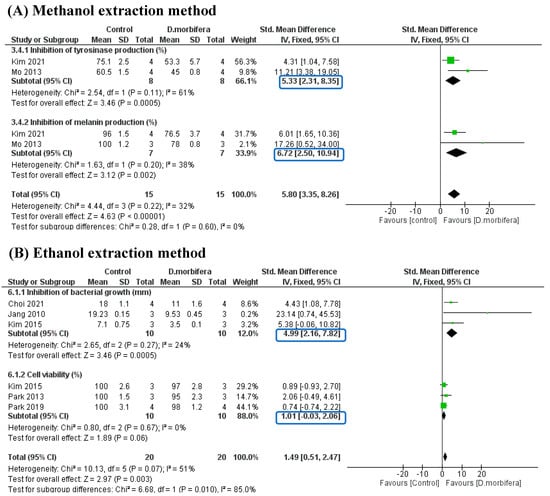 Due to the different extraction methods used in these included studies (e.g., methanol, ethanol, water, n-hexane, and microwave-assisted extractions), subgroup analyses were designed to evaluate the beneficial effects of DME in improving skin appearance. However, due to the limited number of included studies, subgroup analyses were performed only on methanol and ethanol extractions, which could show statistical significance outcomes when comparing the control and treatment groups.