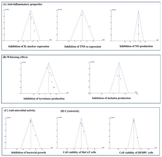 The main characteristics of the 16 included studies are summarized in Table 1. Four studies reported the anti-inflammation effects of DME in skin treatment [12,15,24,25]. Four studies investigated the antimicrobial properties of DME [4,16,19,26]. Seven studies demonstrated the whitening effects of DME for improving skin appearance [3,5,13,14,21,27,28]. The biocompatibility of the extracts with human skin and hair cell lines was investigated in five studies [4,12,13,14,29]. All the included studies were conducted only in Korea between 2010–2024, since D. morbifera is cultivated primarily in Korea. Various parts of D. morbifera, including the leaves (n =15), wood (n = 1), stems (n = 1), and branches (n = 3), were used in the studies. D. morbifera underwent various extraction methods, such as methanol, ethanol, hot water extraction, and microwave-assisted extraction, before being tested in vitro on human cell lines and bacteria. Most studies reported high antioxidant compounds (flavonoids and polyphenolics), suggesting high biocompatibility properties. The studies included three major experimental subject types: normal human cells (HFDPC and HaCaT cells), cancer cells (RAW264.7, L929, B16F10, and EL-4 T), and bacteria (S. aureus, S. mutans, and P. acnes). The extracted data from several main outcomes, such as cell viability (%), inhibition of the expression of pro-inflammatory markers (IL and TNF-) (pg/mL), NO, inhibition of bacterial growth (%), and inhibition of melanin, tyrosinase, and elastase productions (%), were used in the meta-analysis to increase the statistical significance of the results.