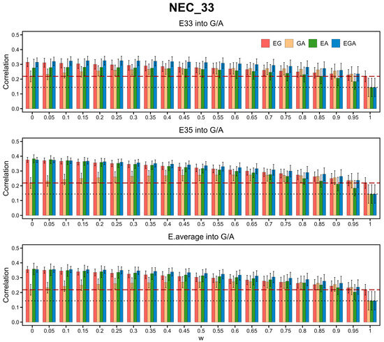 Prediction accuracy of the BLUP methods employing the genetic relationship matrix (GRM) , , , , , and for the neutrophil count trait (NEC_33) of pigs 33 days old under different w values. The black dotted lines and red dashed lines represent the prediction accuracy of ABLUP_D and GBLUP_D, respectively. The red, yellow, green, and blue bars represent the prediction accuracy of ssEGBLUP_D, ssGABLUP_D, ssEABLUP_D, and ssEGABLUP_D under different w values. E33, E35, and E.average represent gene expression data of pigs aged 33 and 35 days as well as the average gene expression value on which GRMs were constructed, respectively.