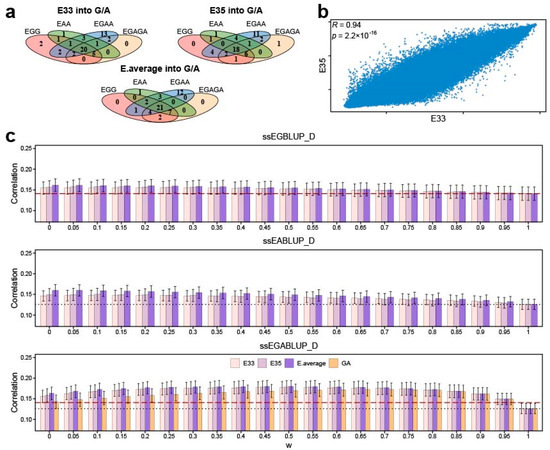 Overall prediction accuracy of methods integrating E33, E35, and E.average. (a) Venn diagram of the number of traits with high prediction accuracy when gene expression data were integrated into GRMs for the 54 traits of the Duroc × Erhualian F2 pig population. (b) Correlation between gene expression data of pigs aged 33 and those of pigs aged 35 days. (c) Average prediction accuracy of ssEGBLUP_D, ssEABLUP_D, and ssEGABLUP_D models integrating E33, E35, and E.average data for 54 traits of Duroc × Erhualian F2 pig population under different w values. The black dotted lines and red dashed lines represent the average prediction accuracy of ABLUP_D and GBLUP_D, respectively. The pale pink, light purple, purple, and orangebars indicate the average prediction accuracy of E33, E35, E.average, and ssGABLUP_D under different w values.