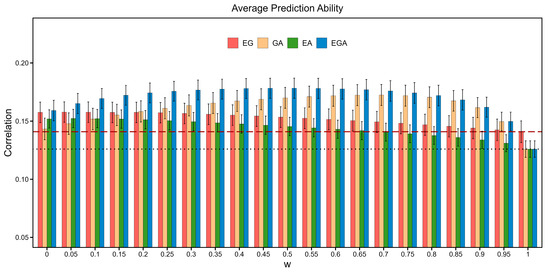 Average prediction accuracy of BLUP methods employing the genetic relationship matrix (GRM) , , , , , and for 54 traits of the Duroc × Erhualian F2 pig population dataset under different w values. The black dotted lines and red dashed lines represent the average prediction accuracy of ABLUP_D and GBLUP_D, respectively. The red, yellow, green, and blue bars denote the average prediction accuracy of ssEGBLUP_D, ssGABLUP_D, ssEABLUP_D, and ssEGABLUP_D under different w values.