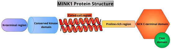 Misshapen/NIKs-related kinase (MINK) 1 is involved in the pathogenesis of numerous pathological conditions, such as autoimmune diseases, neurodegeneration, cardiovascular system malfunctions, and cancer [1,2,3,4]. It belongs to the family of mammalian germinal center kinase (GCK) and is also known as mitogen-activated protein kinase kinase kinase kinase 6 (MAP4K6), MINK, YSK2, B55, or ZC3 [5]. There are three known MINK1 ohnologues—paralogs originating from whole genome duplications [6], which are TRAF2 and NCK-interacting protein kinase (TNIK), mitogen-activated protein kinase kinase kinase kinase 4 (MAP4K4), and Nik-related protein kinase (NRK). MINK1 has only one Drosophila homolog—Misshapen—and serine/threonine-protein kinase mig-15 (MIG-15) is the C. elegans homolog of all four ohnologues mentioned. Along with TNIK, NIK, MIG-15, Misshapen, and NRK, MINK1 belongs to a branch separated from the group I and II GCK kinases, with different evolutionary roots than the two mentioned groups [7]. GCK kinases are part of the family of Ste20-related kinases, which also include the p21-activated kinases (PAKs). The kinases play a role in signaling pathways involving mitogen-activated protein kinases (MAPKs), regulate cytokinesis and cell growth [2,3,4,5,6,7,8], and are highly conserved from yeast to mammals [8]. Importantly, MINK1 is a crucial regulator of various cellular and tissue processes, particularly in response to diverse stress signals, as well as in the context of cell development and differentiation [3,9]. In addition, MINK1 expression has been demonstrated in multiple tissues and organs, including nervous tissue, kidneys, cancer tissues, and immune system cells, which will be discussed in detail in the following sections of the text. As demonstrated by Dan et al. via northern blotting, the MINK transcript is present mainly in the brain, but also in the kidney, spleen, and heart. Moreover, the kinase expression is enhanced during postnatal brain development in mice [7].