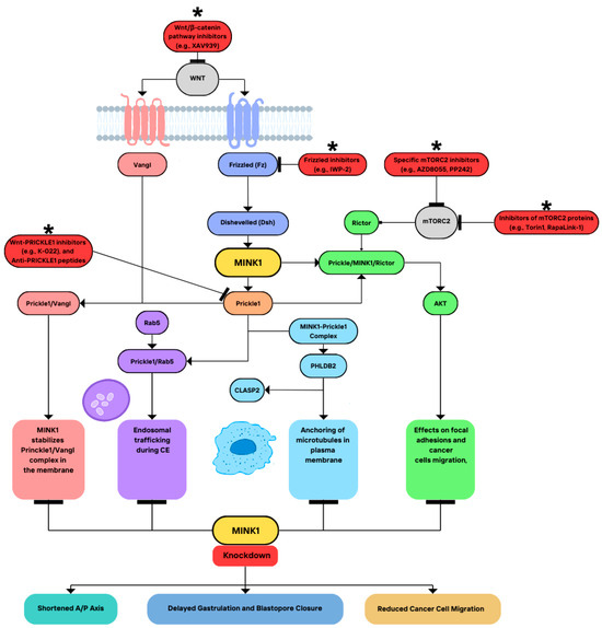 The signaling interactions between the Wnt/Frizzled pathway, MINK1, Prickle1, and their downstream effects on cellular processes. Fz—Frizzled; Dsh—Dishevelled; MINK1—Misshapen-like kinase 1; mTORC2—mammalian target of rapamycin complex 2; AKT—protein Kinase B; Vangl—Van Gogh-like protein; Prickle1—Prickle-like protein 1; Rab5—Ras-related protein Rab-5; CE—convergent extension; CLASP2—cytoplasmic linker associated protein 2; PHLDB2—pleckstrin homology-like domain Family B Member 2; and A/P axis—anterior–posterior axis, *—the possible inhibitors of the relevant components in the presented signaling pathways.
