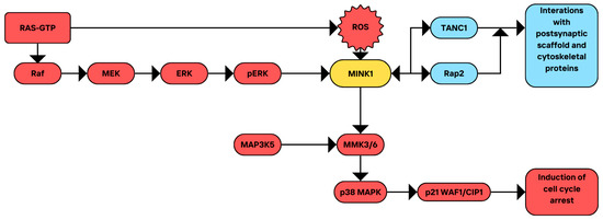 MINK1 and RAS signaling interactions. ERK—extracellular signal-regulated kinase; MEK—mitogen-activated protein kinase kinase; RAS-GTP—Ras guanosine triphosphate; Raf—rapidly accelerated fibrosarcoma kinase; pERK—phosphorylated extracellular signal-regulated kinase; MINK1—Misshapen-like kinase 1; ROS—reactive oxygen species; MAP3K5—mitogen-activated protein kinase kinase kinase 5; MMK3/6—mitogen-activated protein kinase kinase 3/6; p38 MAPK—p38 mitogen-activated protein kinase; p21 WAF1/CIP1—p21 wild-type p53-activated fragment 1/cyclin-dependent kinase-interacting protein 1; Rap2—Ras-related protein Rap2; and TANC1—tetratricopeptide repeat, ankyrin repeat, and coiled-coil containing 1.