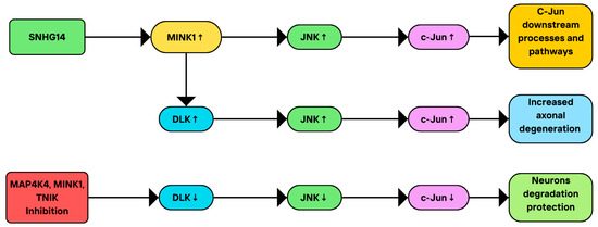 Drosophila Ste20-related kinase misshapen (Msn) has been shown to act upstream from DJNK [73] and several studies demonstrated the importance of MINK1 in pathways involving JNK signaling. MINK can activate JNK1, as reported by Dan and colleagues [7]. In addition, the human MINK kinase domain has been shown to increase JNK activity, and its C-terminal domain presented similar effects, but to a lesser extent. Variable regions of MINK on the other hand did not affect JNK activation [74]. Another study highlighted the role of MINK in neurodegeneration. Dual leucine zipper kinase (DLK) is essential for axonal degeneration due to growth factor deprivation by activating JNK phosphorylation and transmitting the stress signal to the nucleus [75]. Larhammar et al. showed that the Ste20 kinases MAP4K4, MINK1, and TNIK regulate DLK/JNK signaling in neurons and that their simultaneous inhibition decreases DLK activation and c-Jun phosphorylation, protecting neurons from degeneration [3]. It has also been demonstrated that small nucleolar RNA host gene 14 (SNHG14) may upregulate MINK1, leading to increased c-Jun phosphorylation in THP-1 human macrophage-like cells [76]. The summary of the presented studies on the role of MINK1 in the JNK signaling pathway, including its role in JNK activation and cellular consequences, is illustrated in Figure 4.