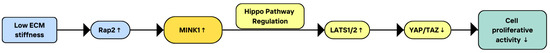 MINK1 and Hippo pathway regulation. ECM—extracellular matrix; Rap2—Ras-related protein 2; MINK1—Misshapen-like kinase 1; LATS1/2—large tumor suppressor kinase 1/2; and YAP/TAZ—Yes-associated protein/WW domain-containing transcription regulator 1.