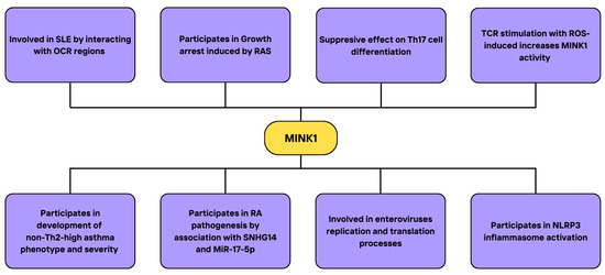 In conclusion, ROS enhance MINK1 expression, while ROS scavengers such as NAC reduce it. The kinase takes part in various immunological processes, suppressing Th17 and Th1 cell differentiation, regulating the secretion of cytokines and NLRP3 inflammasome activation, thus influencing the progression and severity of inflammatory states and autoimmunological diseases that involve the mentioned components, including sepsis, rheumatoid arthritis, asthma, SLE and others. The research on MINK1 offered a deeper insight into the pathogenesis of the mentioned conditions, explaining the possible role of ROS in their onset. Importantly, MINK was also reported to be necessary for the replication process of human enteroviruses, including EV71. Targeting MINK1 could serve as a potential therapeutic strategy for patients suffering from numerous inflammatory diseases, as well as viral infections. Inducing MINK1 expression in asthma or targeting the SNHG14/MINK1 axis in RA could be considered interesting directions for future research. At the same time, a careful examination of factors that influence MINK1 expression in autoimmune diseases could be beneficial in the context of developing new therapeutic approaches. A summary of the MINK1 interactions and its implications on cellular events, processes, and related diseases, along with molecules and signaling pathways regulated by MINK and MINK interactors, is demonstrated in Figure 7.