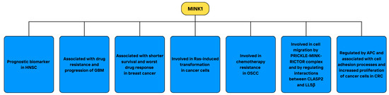 Details about current research considering the role of MINK1 in cancer, including its altered expression, associations with prognosis, and related patomechanisms, are demonstrated in Figure 8. In summary, there is still a lot to uncover regarding the role of MINK1 in oncogenesis. Its range of functions is likely broad, and more studies are needed to elucidate its therapeutic potential in cancer. The role of MINK1 in chemotherapy resistance seems to be especially promising. Novel strategies of MINK1 inhibition in drug-resistant patients could be used to restore their sensitivity to currently available therapies and to improve their prognosis. Targeting MINK1 might also influence the clinicopathological features of cancer patients, reducing cancer cell tendencies for metastasis. Nevertheless, the data on the subject are still limited and the function of MINK1 in cancer requires further investigation.