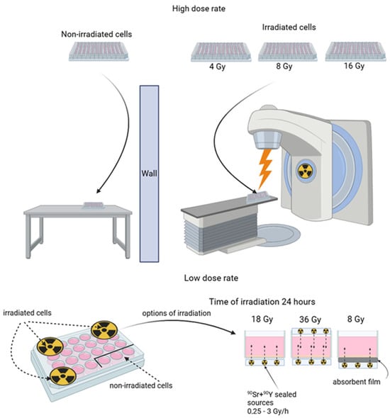 Scheme of the irradiation of A431 human epidermoid carcinoma cells. High-dose-rate irradiation (top panel) was performed using linear accelerator Novalis Tx (Varian, USA); different doses were achieved under fixed device settings by varying exposure time, which did not exceed 10 min. Low-dose-rate irradiation (bottom panel) was performed using beta-emitting 90Sr + 90Y sealed sources; dose precision was achieved under a fixed exposure time of 24 h by the combined use of sources of different activities. The control cells were protected by liquid shielding. For further details, please see Section 2.