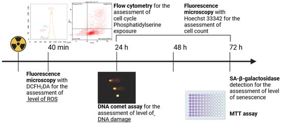 Assessment of the vital functions of the irradiated A431 human epidermoid carcinoma cells. The level of reactive oxygen species (ROS) was assessed 40 min after the start of irradiation by fluorescence microscopy using the ROS indicator DCFH2DA; the level of DNA damage was assessed 24 h after the start of irradiation by the DNA comet assay; cell cycle and cell death type were analyzed 24, 48, and 72 h after the start of irradiation by flow cytometry; the number of cells in the culture was counted 24, 48, and 72 h after the start of irradiation using Hoechst 33342 by fluorescence microscopy; cell count was assessed 72 h after the start of irradiation by the MTT assay; the degree of cellular senescence was assessed 72 h after the start of irradiation by the enzymatic staining of cells for SA-β-galactosidase. For further details, please see Section 2.