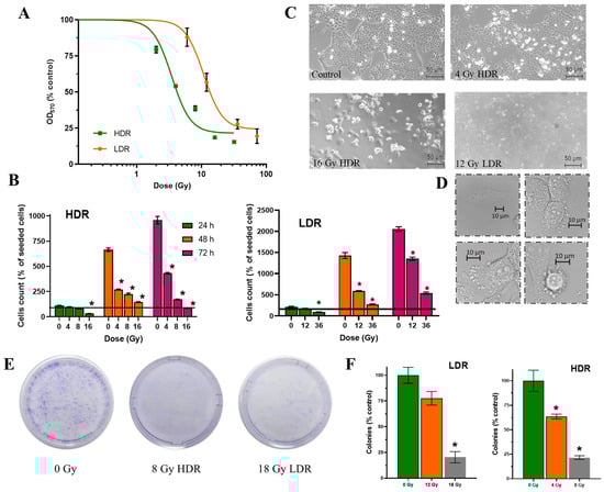 Effects of HDR/LDR irradiation on the A431 cells. (A)—dose–response curves 72 h after HDR and LDR irradiations (MTT assay); (B)—the percentage of live cells in culture 24, 48, and 72 h after each type of irradiation. The line indicates the number of initially attached cells in culture, right before irradiation (fluorescence microscopy). Data are represented as mean ± CV (n = 3 independent biological experiments), where “CV” is the coefficient of variation. “*” indicates a significant difference in cell viability between the non-irradiated and irradiated cells (ANOVA and Dunnett’s test, p < 0.0001); (C)—micrographs of the A431 cells 72 h after HDR and LDR irradiations at various doses; (D)—representative images of the typical morphological features of apoptosis in HDR-irradiated cells; (E)—representative images of culture dishes with stained cell colonies; (F)—the percentage of live cells in culture (clonogenic assay). “*” indicates a significant difference in colony area between the non-irradiated and irradiated cells (ANOVA and Dunnett’s test, p < 0.0001).