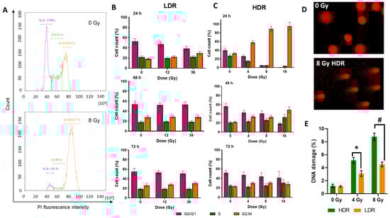 Flow cytometry evaluation of the cell cycle phases of the A431 cells analyzed by propidium iodide (PI) staining and DNA breaks analyzed by the DNA comet test: (A)—example of the distribution of cells by cell cycle phases depending on the amount of stained DNA in the non-irradiated cells, and cells under HDR irradiation after 24 h; (B)—distribution of the A431 cells by cell cycle phases 24, 48, and 72 h after LDR irradiation at various doses (C)—distribution of the A431 cells by cell cycle phases 24, 48, and 72 h after HDR irradiation in various doses. Data are represented as mean ± CV (n = 3 independent biological experiments), where “CV” is the coefficient of variation; (D)—representative images of comets for the DNA damage comet assay; (E)—the percentage of DNA breaks occurring after HDR and LDR irradiations after 24 h. Data are represented as mean ± CV (n = 3 independent biological experiments), where “CV” is the coefficient of variation. “*” and “#” indicate significant differences in the percentage of DNA damage between the non-irradiated cells and cells irradiated at doses of 4 Gy and 8 Gy, respectively (ANOVA and Dunnett’s test, p < 0.05; # p < 0.0001).