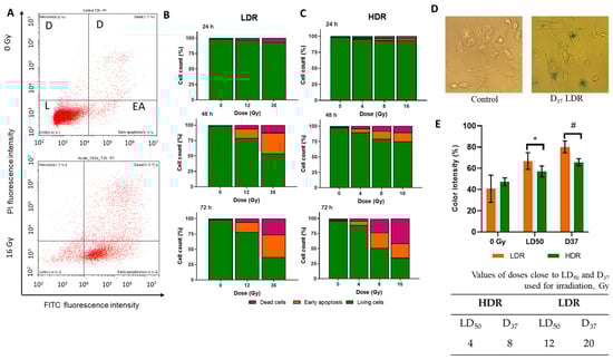 (A)—example of the distribution of cells into live («PI-AnnV-») (L), early apoptotic («PI-AnnV+») (EA), and dead («PI+») (D) in the non-irradiated cells and cells after 72 h after HDR irradiation; (B)—the distribution of the A431 cells into live («PI-AnnV-»), early apoptotic («PI-AnnV+»), and dead («PI+») 24, 48, and 72 h after LDR irradiation at various doses; (C)—the distribution of the A431 cells into live, early apoptotic, and dead 24, 48, and 72 h after HDR irradiation at various doses; (D)— representative images of cells for SA-β-galactosidase assay; (E)—the activation of β-galactosidase in A431 72 h after HDR and LDR irradiations at LD50 and D37. Data are represented as mean ± CV (n = 3), where “CV” is the coefficient of variation. “*” and “#” indicate significant differences in the color intensity between the non-irradiated and irradiated cells (ANOVA and Dunnett’s test, * p < 0.05; # p < 0.0001) Error bars represent the coefficient of variation (CV). The non-irradiated cells were used as control.
