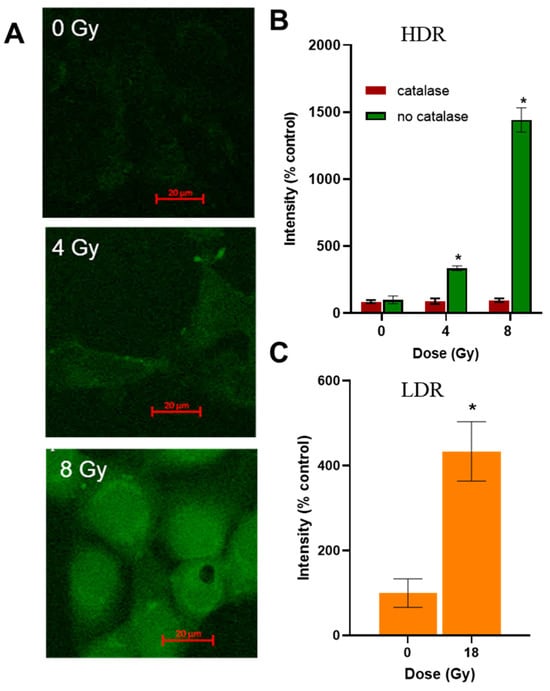 The level of hydrogen peroxide in cells after irradiation was assessed using the fluorescent probe DCFH2DA. After HDR irradiation, an increase in the fluorescence intensity of the probe was observed 40 min after the end of irradiation (Figure 6A). When the cells were preincubated with catalase, the fluorescence intensity of the probe did not increase (Figure 6B). After LDR irradiation at a dose close to LD50, the fluorescence intensity of the probe increased four times (Figure 6C). When irradiated in the HDR mode at a dose of 8 Gy (D37), the fluorescence intensity of the probe increased 15 times (Figure 6B). To confirm the formation of ROS, we present data in Figure S2 on the generation of hydrogen peroxide after irradiation.