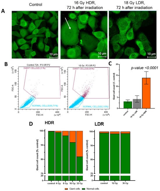 (A)—images of A431 72 h after HDR and LDR irradiations with the formation of “giant cells”. The arrow indicates "giant cells"; (B)—the relative number of “giant cells” 72 h after LDR and HDR irradiations; (C)—distribution of cells into normal cells and “giant cells” in the non-irradiated and HDR-irradiated culture; (D)—the distribution of the A431 cells into normal cells and “giant cells” 72 h after irradiation at various dose rates. Error bars represent the coefficient of variation (CV).