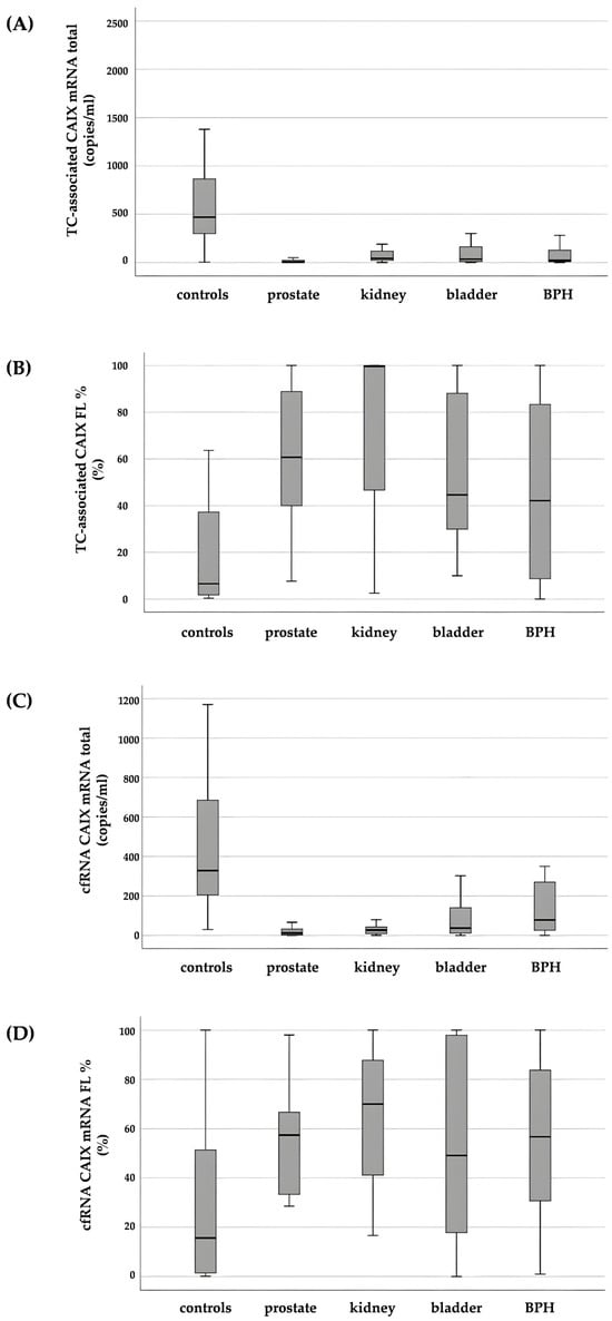 All supernatant samples in our series were positive for 18S, total and FL CAIX. Total CAIX was significantly higher in healthy subjects than in patients with urogenital cancer (p < 0.001), regardless of tumor type (prostate, kidney, bladder), or BPH (p < 0.001) (Figure 1C). Moreover, total CAIX was greater in BPH patients than in those with prostate cancer (p = 0.003), while CAIX cfRNA levels were highest in the bladder and lowest in prostate carcinoma (Table 2).