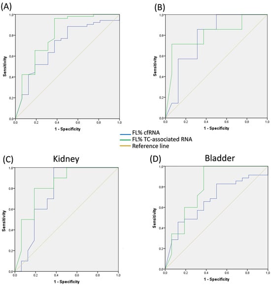 ROC curves univariate logistic analysis. Comparison of the predictive value of CAIX FL% cfRNA and TC-RNA from urine samples of patients with urogenital cancers: (A) overall evaluation in all types of cancer; (B) prostate, (C) kidney and (D) bladder cancer.