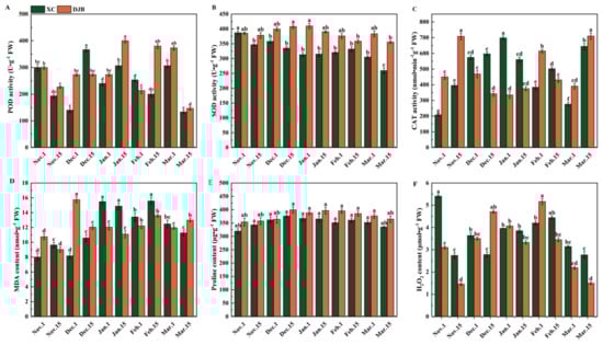 Effects of antioxidant enzyme activity, MDA, Proline, and H2O2 content in XC and DJB peach flower buds at different dormant stages. Note: (A–C) POD, SOD, and CAT enzyme activities of peach flower buds at different dormant stages. (D) MDA content of peach flower buds at different dormant stages. (E) The Proline content of peach flower buds in different dormant stages. (F) H2O2 content in peach flower buds at different dormant stages. Letters a–f in the figure indicate data significance, (p < 0.05).