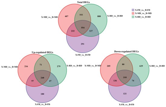 The expression levels of 228 genes were upregulated, while 184 genes were downregulated in the comparison between the X-FD and D-FD stages. In the comparison between X-MD and D-MD stages, there were 1641 specifically upregulated differentially expressed genes (DEGs) and 3288 specifically downregulated DEGs. Furthermore, in the comparison between X-RD and D-RD stages, there were 2880 specifically upregulated DEGs and 1441 specifically downregulated DEGs (Figure 2). Generally, a higher number of DEGs was observed in flower buds at the MD stage compared to those at the RD and FD stages. Additionally, dormant flower buds exhibited the lowest number of DEGs with no significant difference observed between up- and down-regulated DGEs.