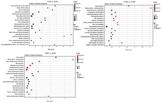 Enrichment analysis of KEGG pathways in X-RD_ vs. _D-RD revealed significant involvement in photosynthesis, photosynthesis-antenna proteins, cutin, suberine and wax biosynthesis, ABC transporters, cyanoamino acid metabolism, phenylpropanoid biosynthesis, and starch and sucrose metabolism. Notably, the most significantly enriched pathways across all three comparison groups were plant-pathogen interaction as well as cutin, suberine, and wax biosynthesis, cyanoamino acid metabolism, phenylpropanoid biosynthesis, along with starch and sucrose metabolism.