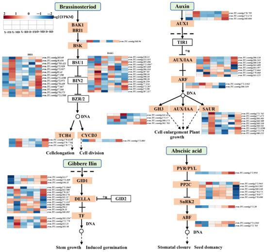 The hormonal pathways of IAA, ABA, GA, and BR signaling were investigated in this study (Figure 7). Our findings revealed that the D-RD treatment led to up-regulation of the AUX1 gene in the IAA signal transduction pathway. Notably, we observed a significant increase in expression levels of the gamma-aminobutyric acid (GAT-1) GABA (evm.TU.contig268.60) gene in DJB compared to XC. Conversely, Auxin response factor ARF2 (evm.TU.contig280.319) exhibited a significant down-regulation in DJB.