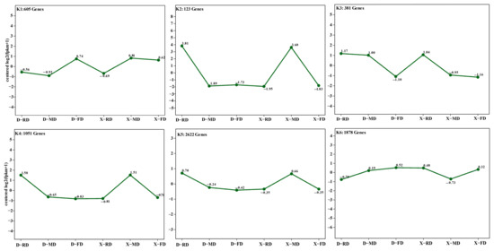 According to the chronological order, genes exhibiting similar expression trends in the samples were clustered and their expression patterns were analyzed. The K-means clustering method was employed for this purpose. To investigate the overwintering mechanism of peach flower buds during the dormancy period, transcriptomes of conventional cultivar XC and cold-resistant cultivar DJB were sequenced at three time points: early dormancy (FD), mid-dormancy (MD), and late dormancy (RD). By performing differential analysis between these time points (X-FD_ vs. _D-FD, X-MD_ vs. _D-MD, X-RD_ vs. _D-RD) and conducting trend analysis using K-means clustering, a total of 6660 genes were classified into six distinct groups denoted as K1 to K6 (Figure 9).