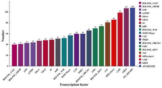 To further investigate the cold tolerance mechanism of peach flower buds, We conducted comprehensive predictions on two varieties of peach buds. The prediction results showed that the top three transcription factor families with the most annotations were AP2/ERF-ERF, bHLH, and C2H2, respectively (Figure 10). The AP2/ERF-ERF family is a crucial transcriptional regulatory family involved in various developmental processes and environmental stress responses across different organisms. Additionally, the bHLH family is widely recognized as a significant transcriptional regulator in plant growth, development, and environmental response. The C2H2 family has also been demonstrated to have a key role in numerous organisms. These findings provide valuable insights for exploring the molecular mechanism underlying cold resistance.