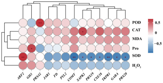 Correlation analysis of FPKM values of differential genes and physiological indexes. * indicates that the p-value is less than 0.05 and the correlation is significant. ** Indicates that the p-value is less than 0.01 and the correlation is extremely significant.