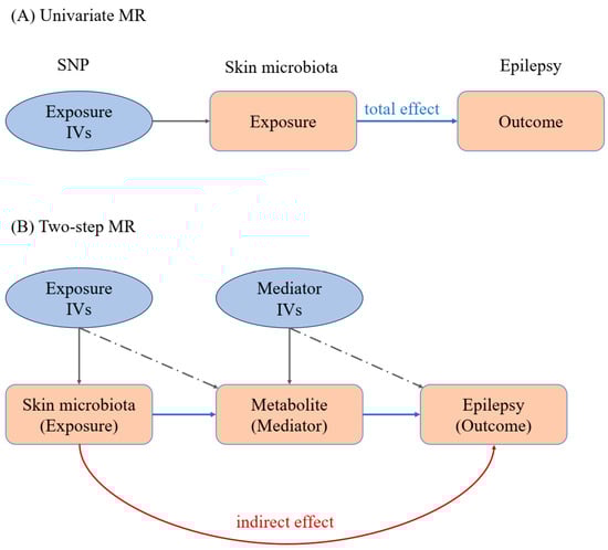 To study the association among skin microbiota, circulating metabolites, and epilepsy, a Mendelian randomization (MR) analysis was conducted to explore whether changes in the skin microbiota can cause changes in blood circulation metabolites, leading to the occurrence of epilepsy. MR is a method in epidemiology that uses genetic variants, for example, single nucleotide polymorphisms (SNPs), as instrumental variables (IVs) to assess the causal relationship between an exposure (skin microbiota) and an outcome (epilepsy) [17]. Since genetic variants are randomly assigned at conception, MR mimics the randomization process in clinical trials, helping to reduce confounding and reverse causation issues common in observational studies. MR provides a way to infer causality by analyzing how genetic predispositions for certain exposures affect health outcomes, offering insights into disease mechanisms and potential therapeutic targets.
