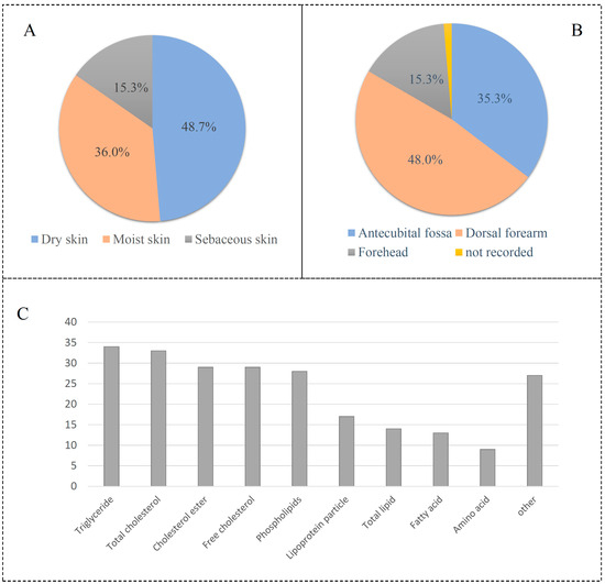 Description of skin microbiota and circulating metabolic biomarkers. (A) Skin type of microbiota; (B) skin location of microbiota; (C) distribution of circulating metabolic biomarkers.