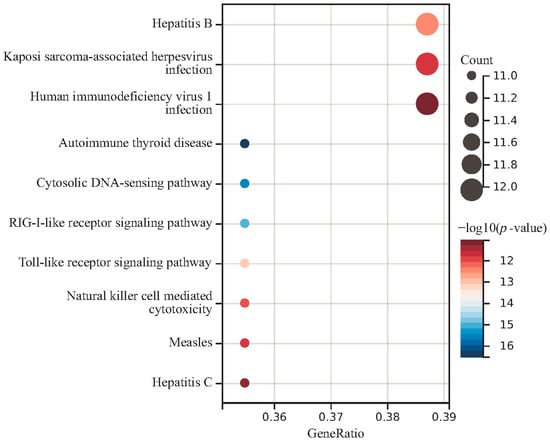 To identify the associated genes with circulating metabolic biomarkers, we applied the FUMA website to identify the SNP-associated genes according to their genomic location. The genes associated with at least two metabolites are shown in Table S3, while the genes with at least three metabolites are shown in Table 6. Overall, we have identified 54 genes and 42 SNPs in the mapping analysis. The gene MLXIPL was found to be associated with four metabolites and the other 19 genes were associated with three metabolites. Gene GCKR is located nearby the SNP rs1260326 and this SNP was found to be associated with three metabolites by GWAS analysis. Moreover, Gene APOE was located near the SNP rs7412 and this SNP was found to be associated with metabolite GCST90302151. Function analysis of these 54 genes indicated that they are enriched in the immune-related pathways, such as autoimmune thyroid disease and the Toll-like receptor signaling pathway (Figure 4). The skin microbiota plays a key role in regulating the skin’s immune responses. Since the immune system and the central nervous system are closely interconnected, disruptions in immune responses triggered by skin microbiota imbalances might have systemic effects, potentially influencing brain function. These results suggest that epilepsy may be associated with the immune system.