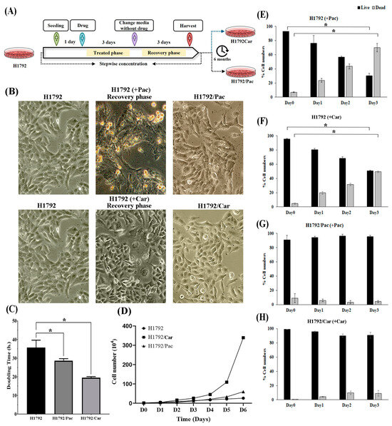 Resistance properties of drug-resistant cell lines. (A) Schematic representation of the experimental workflow used to generate H1792/Car and H1792/Pac cell lines using a stepwise method. (B) Morphological characteristics of parental H1792 cells, H1792 cells in the recovery phase post-treatment with Pac or Car at concentrations of 10 nM and 5 µM, respectively, and drug-resistant cells following recovery were observed under a microscope at 20× magnification. (C) Population doubling time of parental and drug-resistant cells. * Significant differences were determined using an independent t-test (p < 0.05). (D) Growth curves of parental and drug-resistant cells. (E) Live and dead cell counts following treatment of H1792 cells with 50 nM of Paclitaxel. (F) Live and dead cell counts following treatment of H1792 cells with 35 µM of Carboplatin. (G) Live and dead cell counts following treatment of H1792/Pac cells with 50 nM of Paclitaxel. (H) Live and dead cell counts following treatment of H1792/Car cells with 35 µM of Carboplatin. * Significant differences were determined using an ANOVA test (p < 0.05).