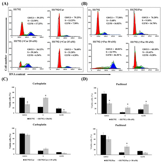 Cell cycle analysis by flow cytometry. (A) Cell cycle distribution in untreated H1792 and H1792/Car cells, and in H1792 and H1792/Car cells treated with Carboplatin at 20 µM and 35 µM, respectively. (B) Cell cycle distribution in untreated H1792 and H1792/Pac cells and in H1792 and H1792/Pac cells treated with Paclitaxel at 50 nM. (C) Representative flow cytometry histograms of cell cycle phases for H1792/Car cells under the indicated conditions. (D) Representative flow cytometry histograms of cell cycle phases for H1792/Pac cells under the indicated conditions. * Significant differences were determined using an independent t-test (p < 0.05).