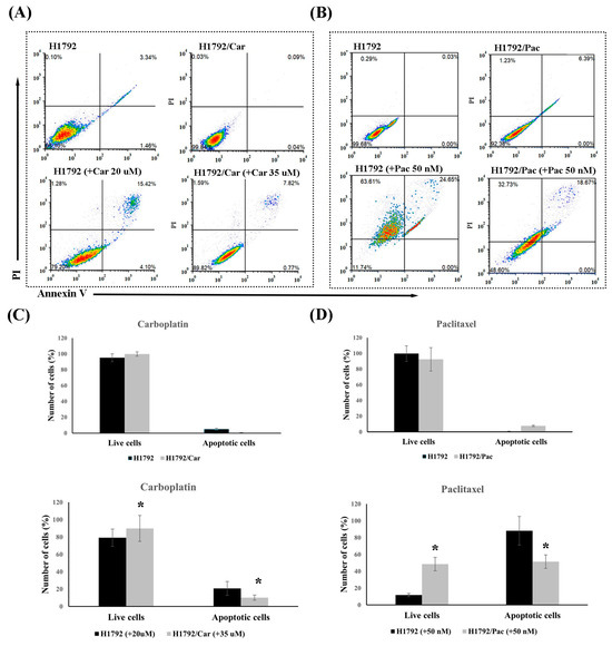 Apoptosis was assessed using the Annexin-V-FITC/PI double staining assay. H1792/Car cells treated with 35 μM of Car demonstrated a higher percentage of live cells (89.82% vs. 79.20%, p = 0.042) and a lower percentage of apoptotic cells (10.18% vs. 20.80%, p = 0.022) compared to parental H1792 cells treated with 20 μM of Car (Figure 3A,C). Similarly, after treatment with 50 nM of Pac, H1792/Pac cells showed a significantly higher percentage of live cells (48.60% vs. 2.00%, p < 0.001) and a significantly lower percentage of apoptotic cells (51.40% vs. 88.26%, p = 0.035) compared to parental H1792 cells (Figure 3B,D). These findings confirm that H1792/Car and H1792/Pac cells exhibit resistance to Car and Pac treatment, respectively.