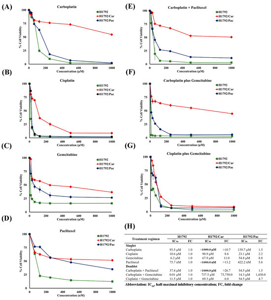 In singlet chemotherapy, parental H1792 cells demonstrated sensitivity to Car, Cis, Gem, and Pac, with IC50 values of 93.5 µM, 10.6 µM, 6.2 µM, and 75.7 nM, respectively. In contrast, the H1792/Car and H1792/Pac cell lines, which were continuously exposed to Car and Pac, exhibited significant resistance. H1792/Car displayed a 10.7-fold increase in resistance to Car (Figure 4A), while H1792/Pac showed a 5.6-fold increase in resistance to Pac (Figure 4D). Additionally, H1792/Car exhibited cross-resistance to all tested chemotherapeutic agents, with resistance levels exceeding 8-fold for each drug (Figure 4B–D,H). H1792/Pac cells demonstrated cross-resistance to Cis and Gem, with FCs of 2.2 and 8.8, respectively (Figure 4A–C,H).