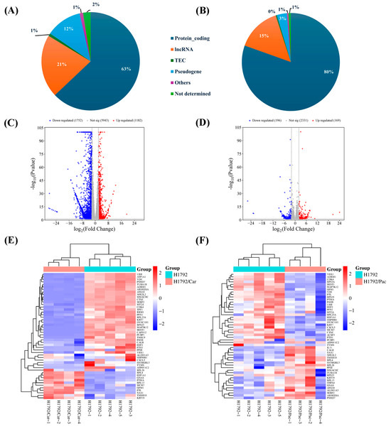 Transcriptomic analysis identified 14,105 genes with a p-value < 0.05 in the H1792 vs. H1792/Car comparison and 3351 genes in the H1792 vs. H1792/Pac comparison. Of these, protein-coding genes constituted 63% (8877 of 14,105 total RNA types) in the H1792 vs. H1792/Car comparison and 80% (2696 of 3351 total RNA types) in the H1792 vs. H1792/Pac comparison (Figure 5A,B). For downstream analyses, only protein-coding genes were selected.