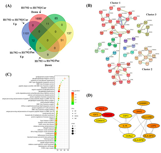 Identification of common DEGs (Co-DEGs) in drug-resistant cell lines. (A) Venn diagram illustrating 72 upregulated Co-DEGs and 51 downregulated Co-DEGs shared between H1792/Car and H1792/Pac datasets. (B) Cluster analysis of Co-DEGs using STRING. (C) Gene Ontology (GO) classification and KEGG pathway enrichment analysis of Co-DEGs. (D) Identification of hub genes based on degree ranking using the cytoHubba plug-in.