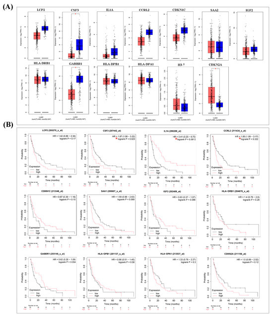 Gene expression and survival analysis. (A) Differential expression of 13 hub genes in lung adenocarcinoma compared to normal tissues, analyzed using the GEPIA2 database. (B) Post-progression survival (PPS) analysis of the 13 hub genes using the Kaplan–Meier Plotter. (*) indicates statistically significant differences compared to normal tissues (p < 0.05).