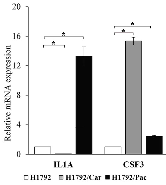 Validation of IL1A and CSF3 gene expression via RT-qPCR. Gene expression levels of IL1A and CSF3 in drug-resistant cell lines (H1792/Car and H1792/Pac) compared to parental H1792 cells. * Significant differences were determined using an independent t-test (p < 0.05).