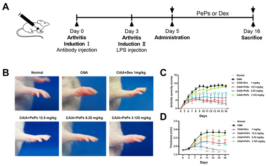 Mice were randomly divided into six groups based on body weight: normal group, CAIA group, CAIA + Dex group (1 mg/kg dexamethasone), CAIA + PePs (12.5 mg/kg) group, CAIA + PePs (6.25 mg/kg) group, and CAIA + PePs (3.13 mg/kg) group. Except for the normal group, arthritis mice were intraperitoneally injected with a mixture of type II collagen monoclonal antibodies (1.5 mg/mouse, Woodinville) and then injected with lipopolysaccharide (LPS, 15 μg/mouse) into the peritoneal cavity three days later. The normal group of mice received an equal amount of phosphate-buffered saline (PBS). Two days later, the CAIA mice were orally administered saline, and the CAIA + Dex group received a daily oral gavage of dexamethasone (1 mg/kg), while the three PePs groups were administered a daily oral gavage of PePs at the indicated doses (12.5 mg/kg, 6.25 mg/kg, 3.13 mg/kg).