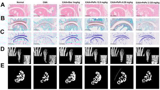 Anti-arthritis effects of histological symptoms by PePs in mouse CAIA model. Representative images of ankle joint sections stained with H&E (A), toluidine blue (B), and safranin O-fast green (C). Representative 3D reconstruction (D) and cross-section (E) images of right hind paws of mice from each group.