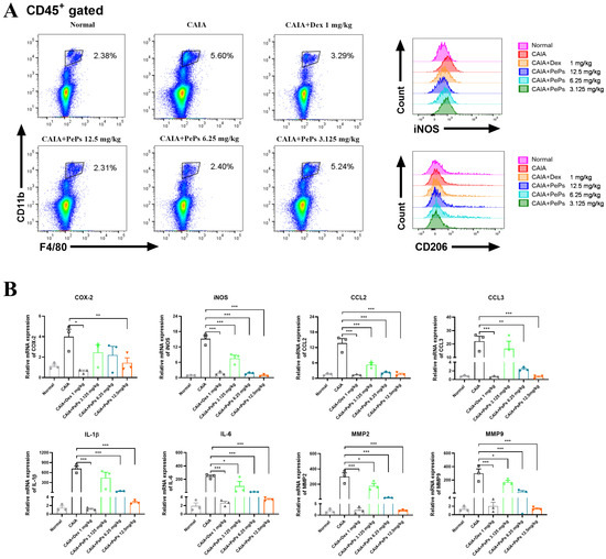 The infiltration of M1 macrophages into the synovium and the subsequent increase in the M1/M2 ratio are considered indicators of rheumatoid arthritis progression. Flow cytometric analysis further demonstrated that PePs regulated macrophage polarization in vivo. Specifically, the frequency of CD11b+F4/80+ macrophages expressing iNOS (M1 marker) was reduced in splenocytes, indicating a shift from pro-inflammatory M1 macrophages to anti-inflammatory M2 macrophages (CD11b+F4/80+CD206+, M2 marker) (Figure 3A). These findings collectively suggest that PePs alleviate joint inflammation and structural damage in CAIA mice while promoting a shift toward anti-inflammatory macrophage phenotypes. At the gene expression level, PePs treatment resulted in attenuated mRNA expression levels of pro-inflammatory factors, including COX-2, iNOS, CCL2, CCL3, IL-1β, IL-6, MMP2, and MMP9, secreted by M1 macrophages at the joint site in CAIA mice (Figure 3B). The in vivo results indicate that PePs have the potential to ameliorate CAIA by modulating macrophage polarization.
