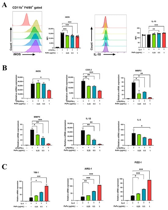 PePs regulate polarization of M1 and M2 on RAW264.7 cells. Representative flow cytometry histograms and mean fluorescence intensity of iNOS+ cells or CD206+ cells among macrophage populations (gated by CD11b+F4/80+) (A). mRNA levels of COX-2, iNOS, IL-1β, IL-6, MMP2, and MMP9 in RAW264.7 cells stimulated with LPS/IFN-γ with or without preincubation of indicated concentrations of PePs for 6 h, assessed by qRT-PCR (B). mRNA levels of YM-1, ARG-1, and FIZZ-1 in RAW264.7 cells stimulated with IL-4, with or without preincubation of indicated concentrations of PePs for 6 h, assessed by qRT-PCR. (C) Data are presented as mean ± SEM. * p < 0.05, ** p < 0.01, *** p < 0.001, indicating significance compared to LPS/IFN-γ or IL-4 group.