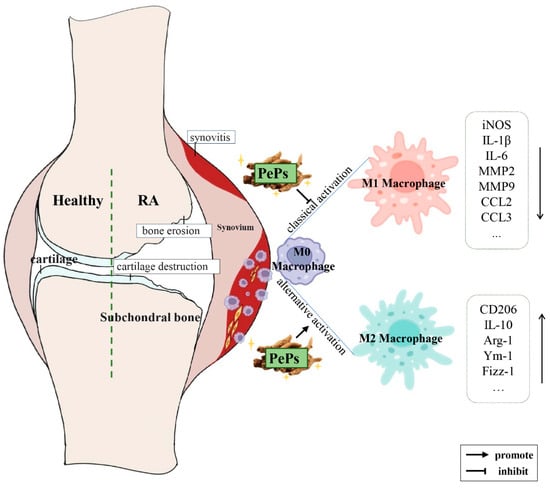 Schematic diagram of underlying therapeutic mechanisms of PePs. PePs relieve arthritis by modulating macrophage polarization between M1 and M2 phenotypes. Downward arrows indicate a decrease in the expression of relevant markers, while upward arrows indicate an increase in the expression of relevant markers.