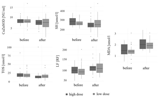 A significant increase in the levels of LF [RF] and MDA [µmol/l] (both p < 0.01) was noted, regardless of the medication used (p = 0.78 and p = 0.55, respectively). An increase in the concentrations of CER [mg/dl] (p = 0.33), TAC [mmol/l] (p = 0.17), and MnSOD [NU/mL] (p = 0.08) was observed over the course of the study. However, it was not statistically significant. A significant decrease in the concentrations of SH [µmol/l] (p < 0.01), CuZnSOD [NU/mL] (p = 0.02), and TOS [µmol/l] (p < 0.01) was observed during supplementation, regardless of the preparation used (p = 0.18, p = 0.67, and p = 0.37, respectively). A decrease in the levels of LHP [µmol/l] (p = 0.08) and SOD [NU/mL] (p = 0.1) was found. However, it was not statistically significant. The concentrations of selected OS parameters at the beginning and the end of the study are given in Table 4. A change in the serum level of selected cytokines depending on the supplemented dose is given in Figure 1.