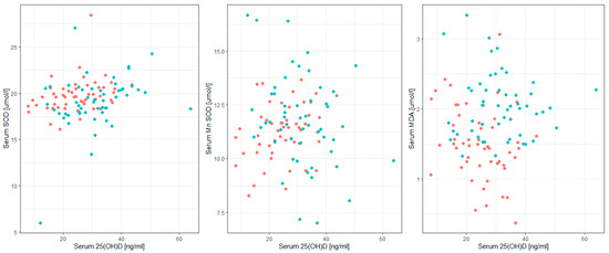 A significant positive correlation was observed between the serum concentrations of 25(OH)D and SOD (p < 0.01) and MnSOD (p < 0.05), while a significant negative correlation was found between serum 25(OH)D and MDA (p = 0.05) at the study onset. However, at the end of the study, a significant positive correlation was reported between the levels of 25(OH)D and SOD (p < 0.05) and CuZnSOD (p < 0.01) in serum. Correlations between the serum level of VitD and the concentration of the selected OS markers at two time points are given in Table 5. The correlations between serum levels of vitamin D and the concentrations of selected oxidative stress markers measured before and after vitamin D supplementation are presented in Figure 2.