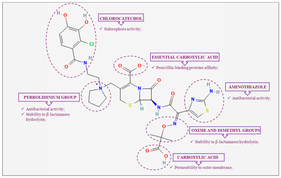 Two-dimensional representation of cefiderocol. Structure activity relationship on Gram-negative bacteria highlighted by the violet dotted circles.