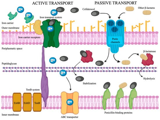 Cefiderocol is a siderophore cephalosporin able to chelate iron ions (Fe3+). This property allows it to enter the bacterial periplasm via iron-carrying outer membrane transport protein (TonB-dependent transport protein). This process of using the bacterial iron acquisition system to enhance the outer membrane permeation is known as the “Trojan horse” strategy. The energy required for this process is provided by the membrane potential and mediated by the endosomal energy transduction TonB–ExbB–ExbD protein complex. This dual entry strategy promotes a faster and higher concentration of the antibiotic in the periplasm. Moreover, the chemical structure of cefiderocol renders this antibiotic more stable against a variety of Ambler A, B, C, and D β-lactamases that are concentrated in the periplasmatic space.