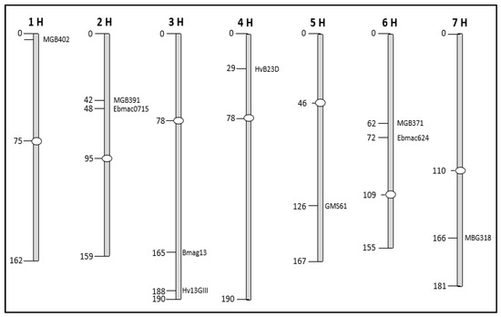 - Liu, Z.W.; Biyashev, R.M.; Maroof, M.A. Development of Simple Sequence Repeat DNA Markers and Their Integration into a Barley Linkage Map. Theor. Appl. Genet. 1996, 93, 869–876. [Google Scholar] [CrossRef] [PubMed]