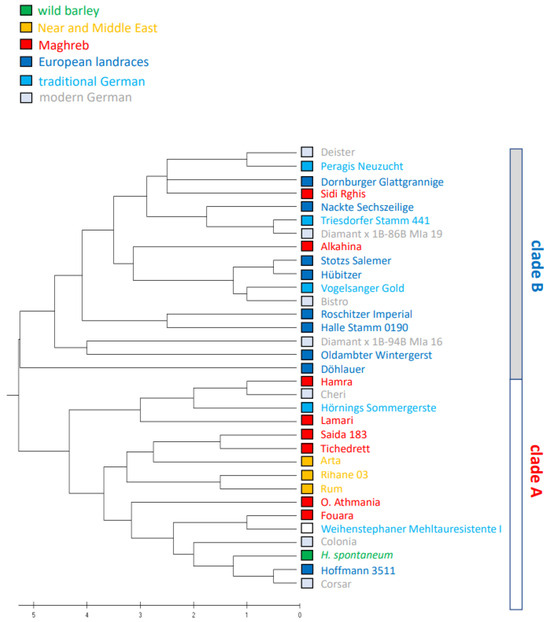 The SSR markers had been selected such that all chromosomes were symmetrically represented [35], such that the inferred phylogenetic tree would reflect phylogeny appropriately. The resulting tree (Figure 2) displayed two clearly separated clades. Clade A harboured all but two of the Algerian varieties, along with all the traditional varieties from the Middle East, and H. spontaneum. Clade B contained exclusively European varieties except the two Algerian varieties Sidi Rghis and Alkahina that derive from crosses with the German variety Express (Table 1) and, thus, is not native to Algeria. Within clade A, the two traditional Algerian landraces Saïda183 and Tichedrett form a twin clade, which is congruent with their origin and autochthonous nature. There are a couple of European varieties that are found in cluster A as well, due to commonalities in ancestry.